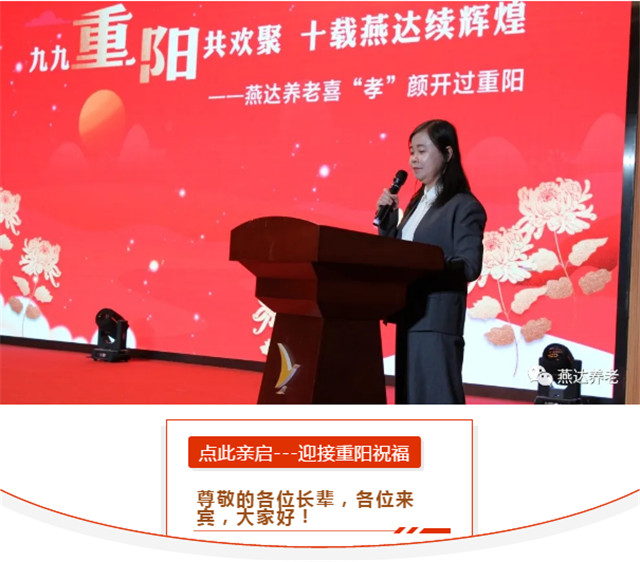 下午14點(diǎn)30整,“九九重陽共歡聚 ?十載燕達(dá)續(xù)輝煌——燕達(dá)養(yǎng)老喜‘孝’顏開過重陽”活動正式開始。燕達(dá)國際健康城副總裁李海燕女士隆重致辭。