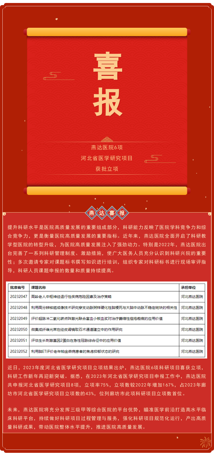 【喜報(bào)】燕達(dá)醫(yī)院6項(xiàng)河北省醫(yī)學(xué)研究項(xiàng)目獲批立項(xiàng)